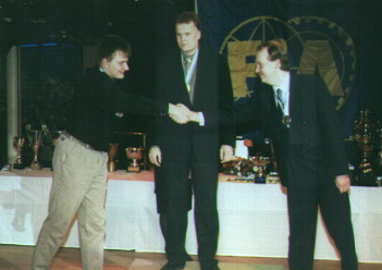 Marraskuu 1998, AKK/FIA palkintojenjako-risteily. Super Gasin mitalikolmikko noutamassa palkintojaan. Keskellä Suomen mestari Jari Hongisto, vasemmalla Vesa Raiski ja oikealla Jari Parén.